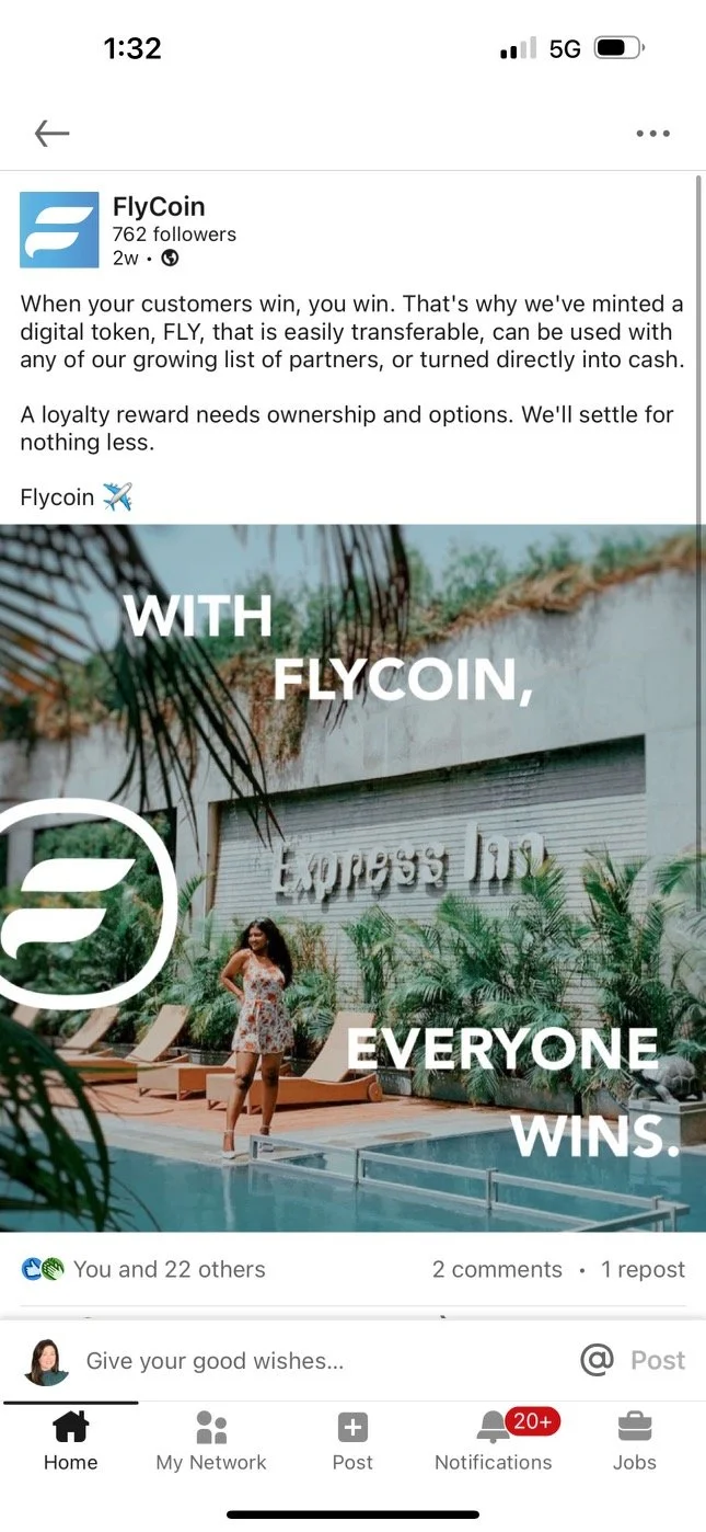 With a full brand, app, and website funnel built, we launched Flycoin across Instagram, Facebook and LinkedIn. All with individual content strategies.
